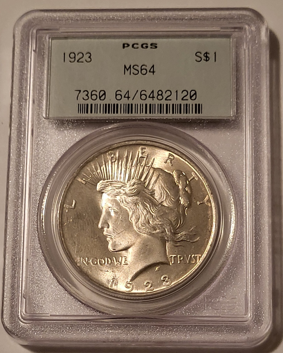 6482120 | 1923 Peace Silver Dollar. Philadelphia Mint. Silver. Mint State 64 PCGS Old Green Holder. Light Patina.