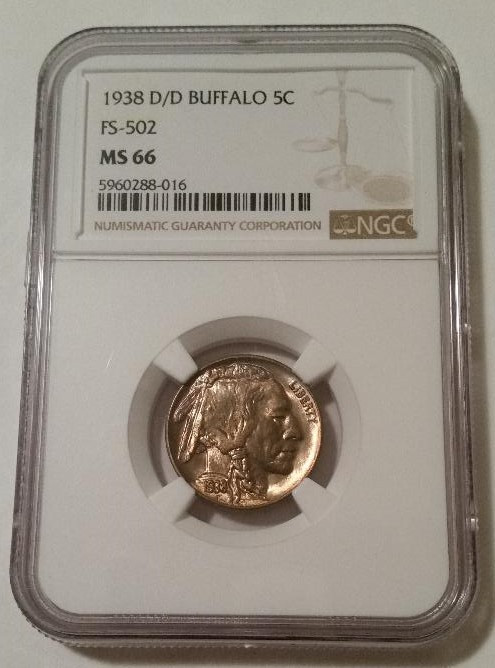 5960288016 | 1938 D/D Buffalo Nickel. Copper-Nickel. Re-Punched Mint Mark Variety, FS-502. Mint State 66 NGC. Nice Toning.