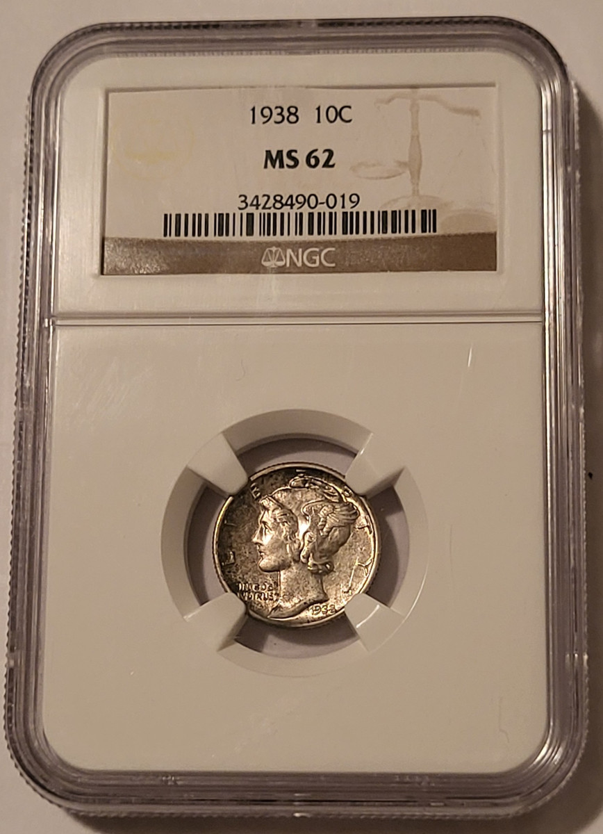 3428490019 | 1938 Mercury Dime. Philadelphia Mint. Silver. Mint State 62 NGC. Toned.