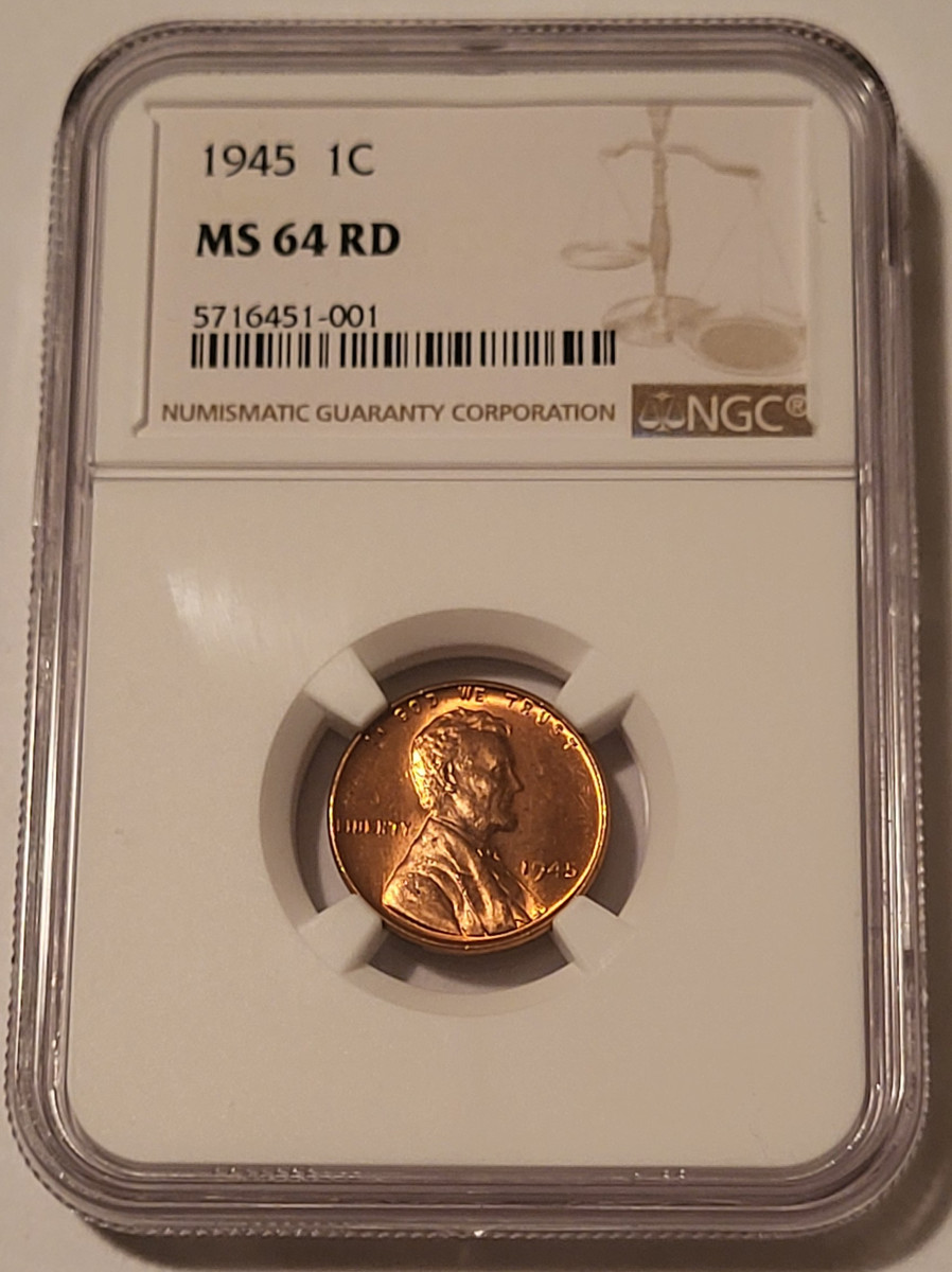 5716451001 | 1945 Lincoln Wheat Cent. Philadelphia Mint. Bronze. Mint State 64 Red NGC.
