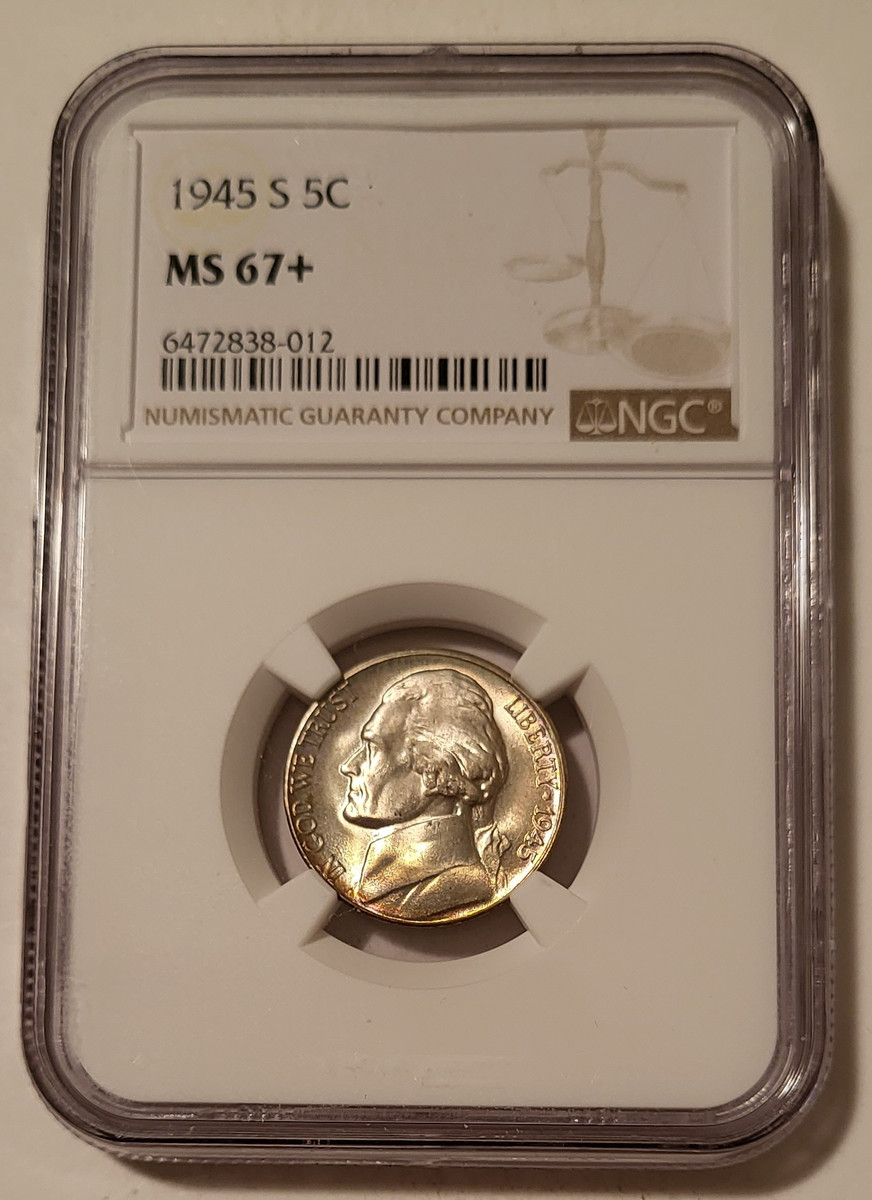 6472838012 | 1945 S Jefferson Nickel. WWII, Silver. Mint State 67+ NGC. Nice Patina.