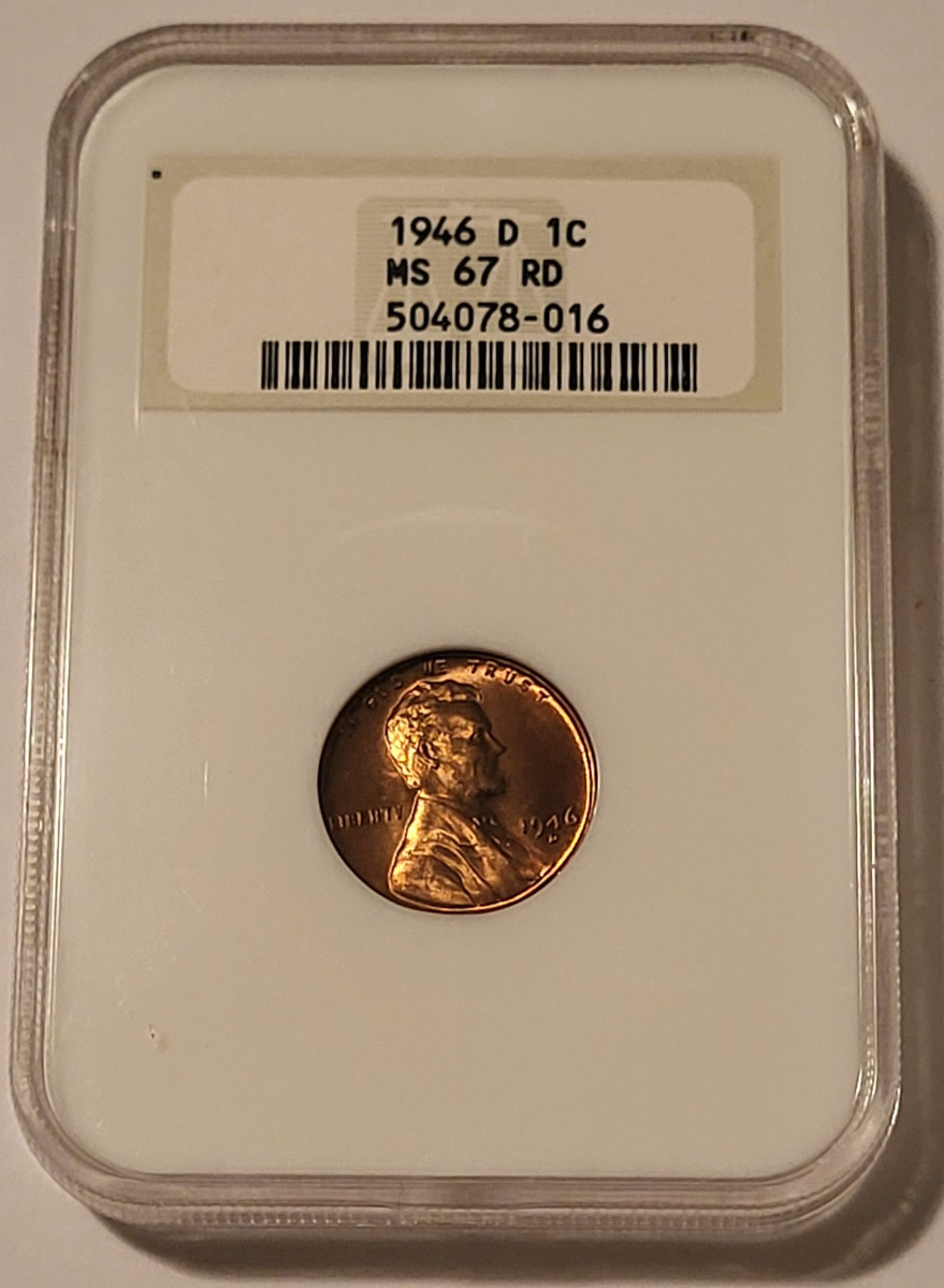 504078016 | 1946 D Lincoln Wheat Cent. Bronze. Mint State 67 Red NGC. Early Generation "Old Fatty" Holder.