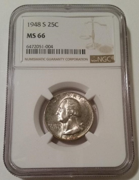 6472051004 | 1948 S Washington Quarter. Silver. Mint State 66 NGC. Toning.
