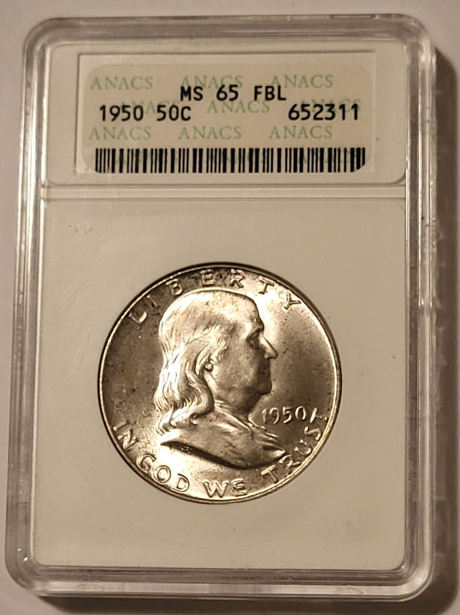 652311 | 1950 Franklin Half Dollar. Philadelphia Mint. Silver. Mint State 65 Full Bell Lines ANACS. Areas of toning. Early Generation, Small Holder.