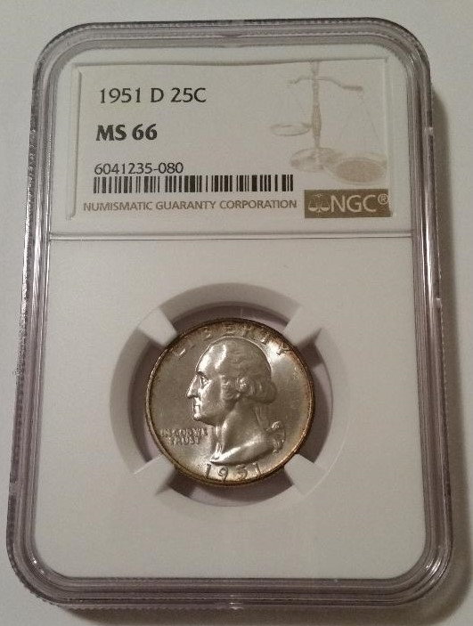 6041235080 | 1951 D Washington Quarter. Silver. Mint State 66 NGC. Toned.
