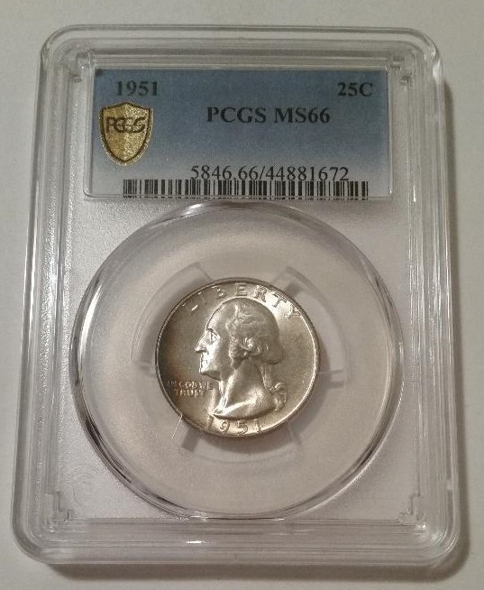44881672 | 1951 Washington Quarter. Philadelphia Mint. Silver. Mint State 66 PCGS. Toning. Gold Shield Holder.