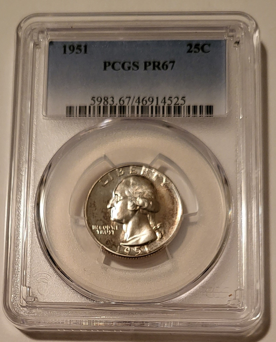 46914525 | 1951 Washington Quarter. Philadelphia Mint. Silver. Proof-67 PCGS. Obverse Toning. Low proof mintage of 57,500.