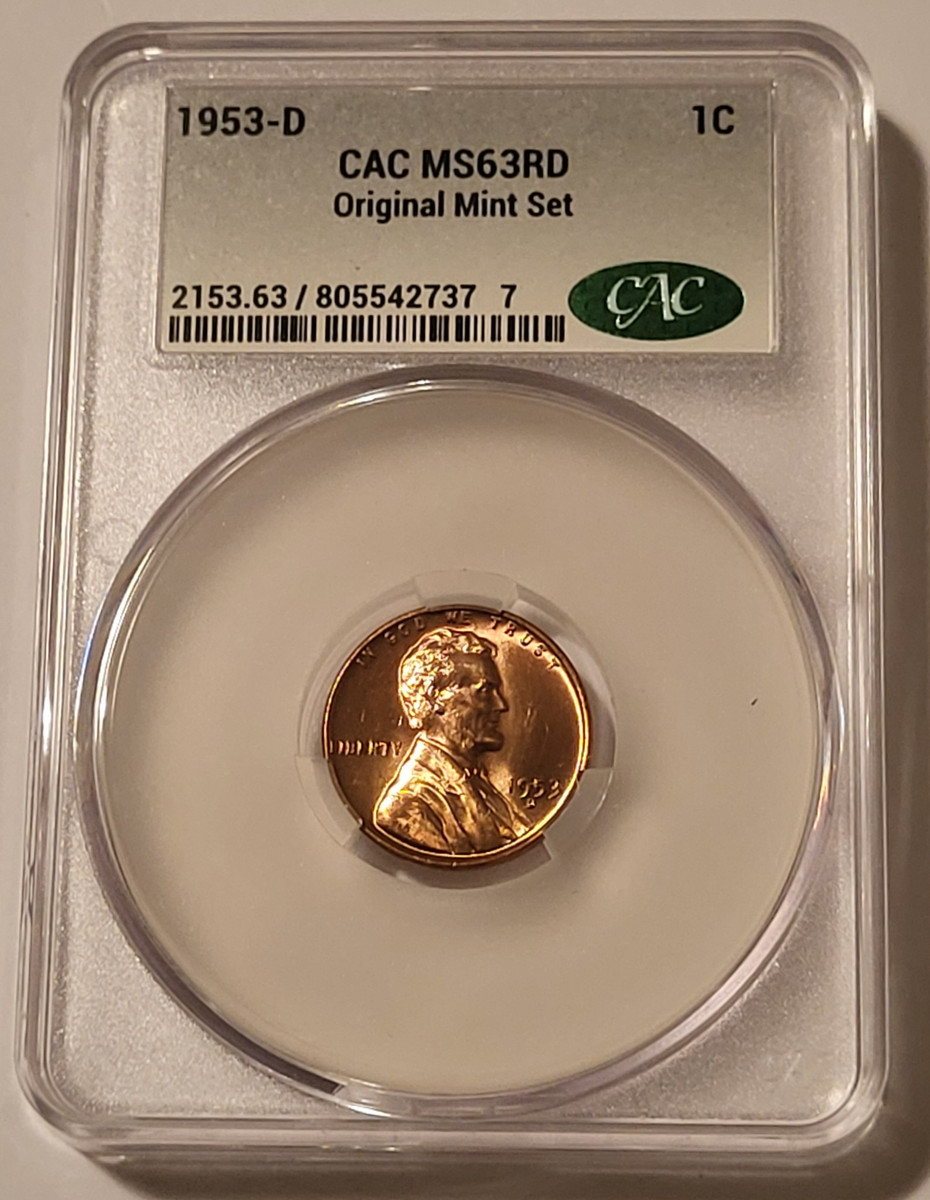 805542737 | 1953 D Lincoln Wheat Cent. Bronze. Mint State 63 Red CACG.