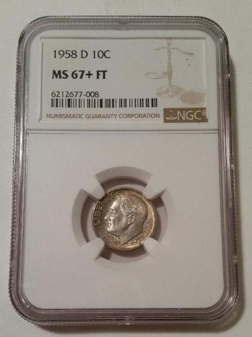 6212677008 | 1958 D Roosevelt Dime. Silver. Mint State 67+ Full Torch NGC. Toning.