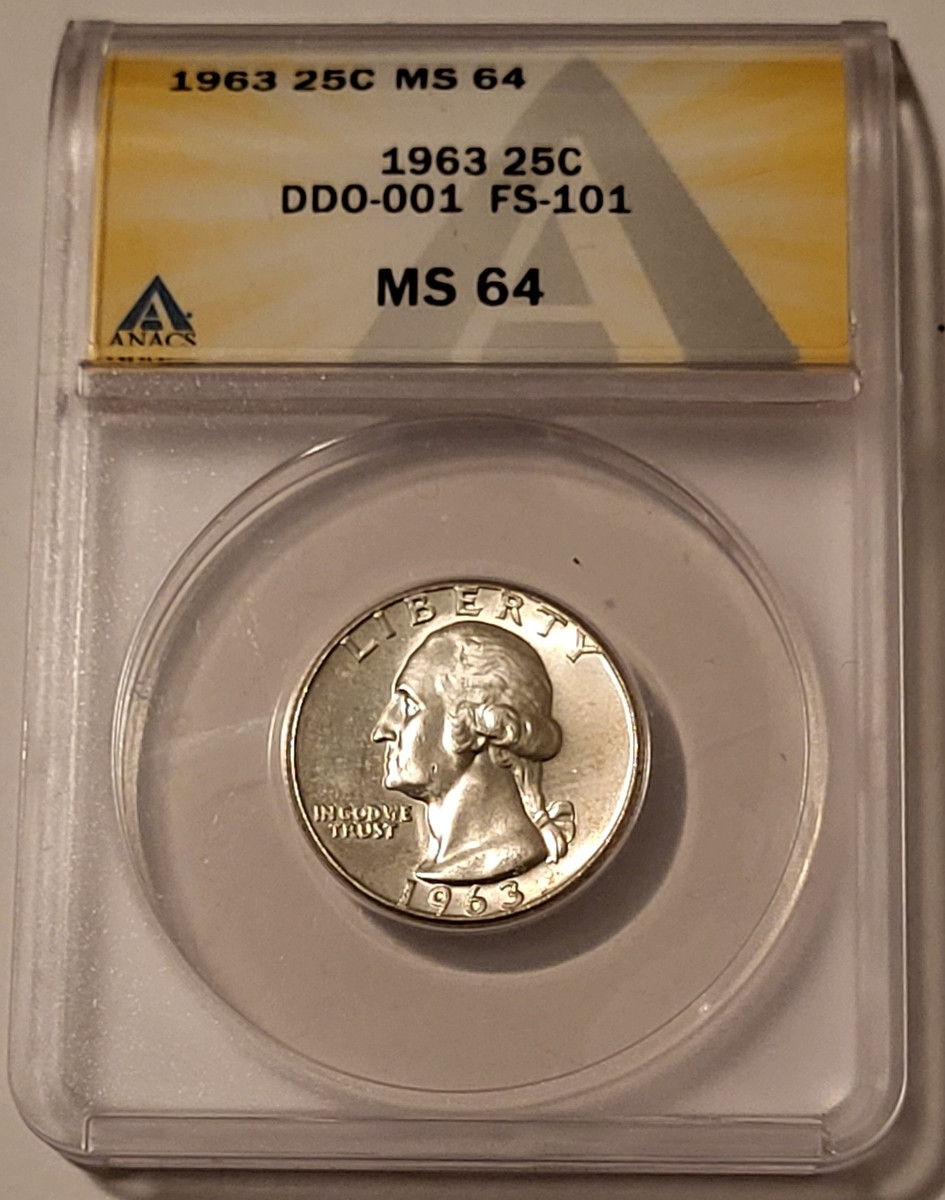 7919446 | 1963 Washington Quarter. Philadelphia Mint. Silver. Double Die Obverse (DD0-001) FS-101. Mint State 64 ANACS.