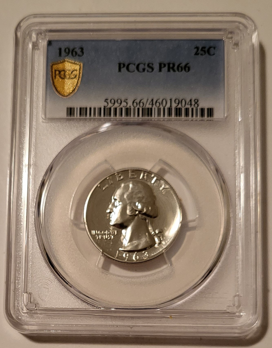 46019048 | 1963 Washington Quarter. Philadelphia Mint. Silver. Proof-66 PCGS Gold Shield Holder. *Photo reflection - no tone or haze.