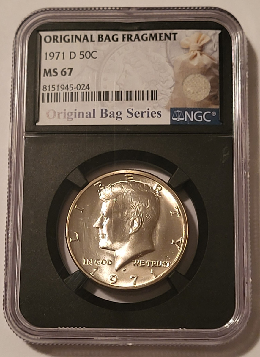 8151945024 | 1971 D Kennedy Half Dollar. Copper-Nickel/Clad. Mint State 67 NGC. Black Retro Holder/Original Bag Fragment.