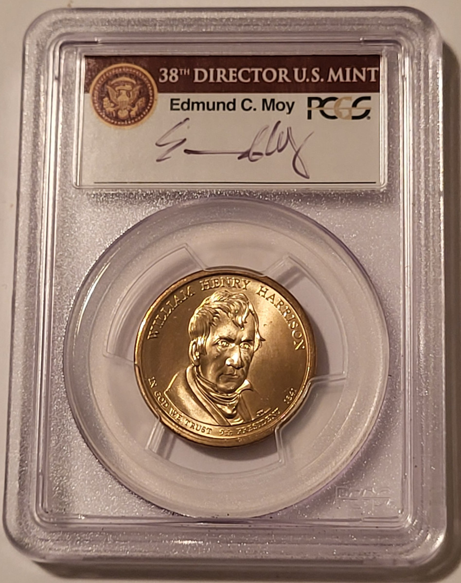 31546003 | 2009 William Henry Harrison Presidential Dollar. Mint Error: Missing Edge Lettering. Mint State 66 PCGS. Edmund C. Moy Hand-Signed Label.