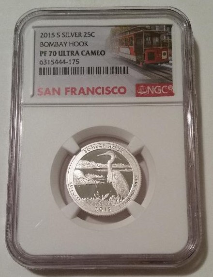 6315444175 | 2015 S Silver Bombay Hook National Park Quarter. Proof-70 Ultra Cameo NGC Trolley Label.