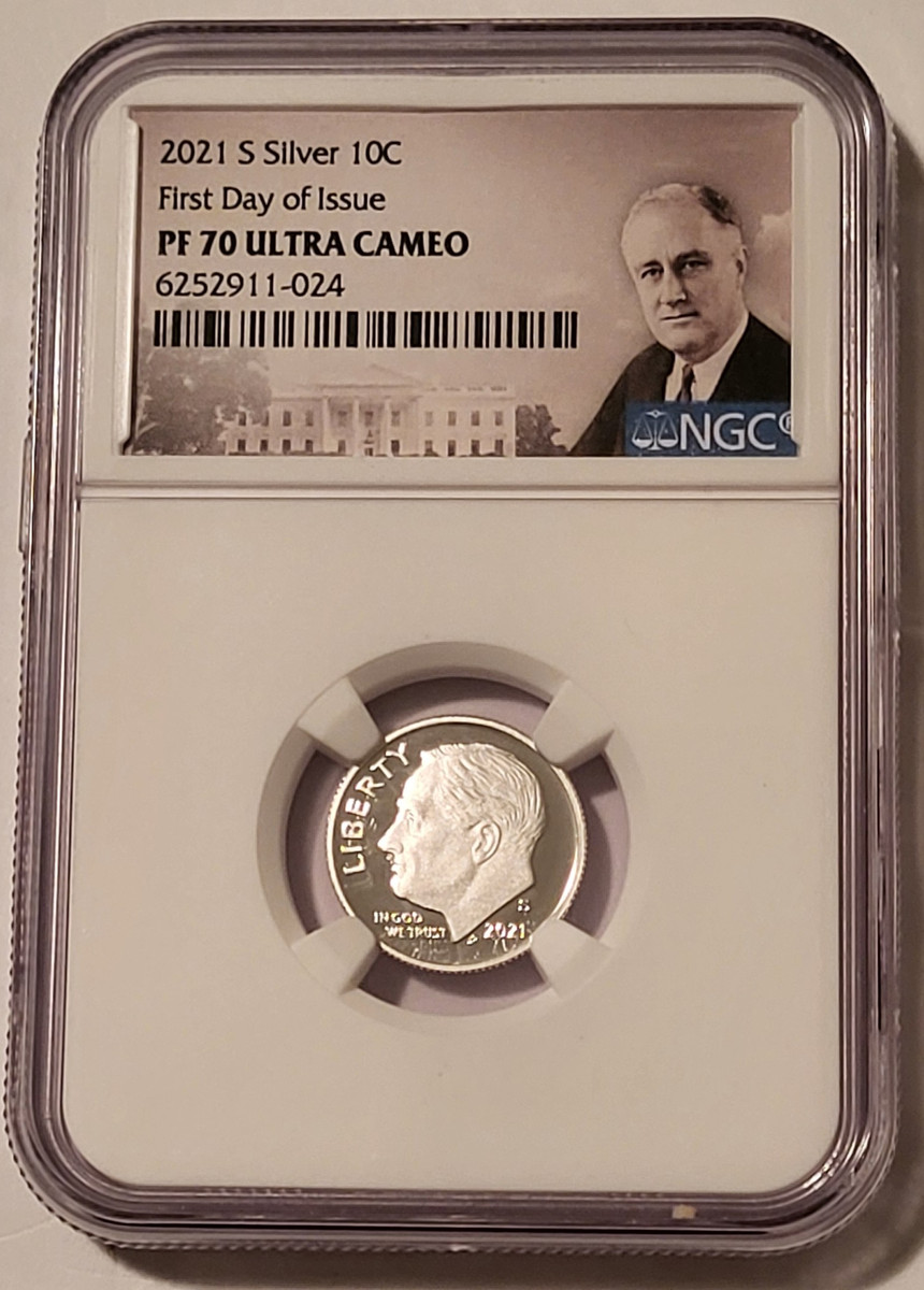 6252911024 | 2021 S Silver Roosevelt Dime. .999 fine. Proof-70 Ultra Cameo NGC Portrait Label. First Day of Issue.