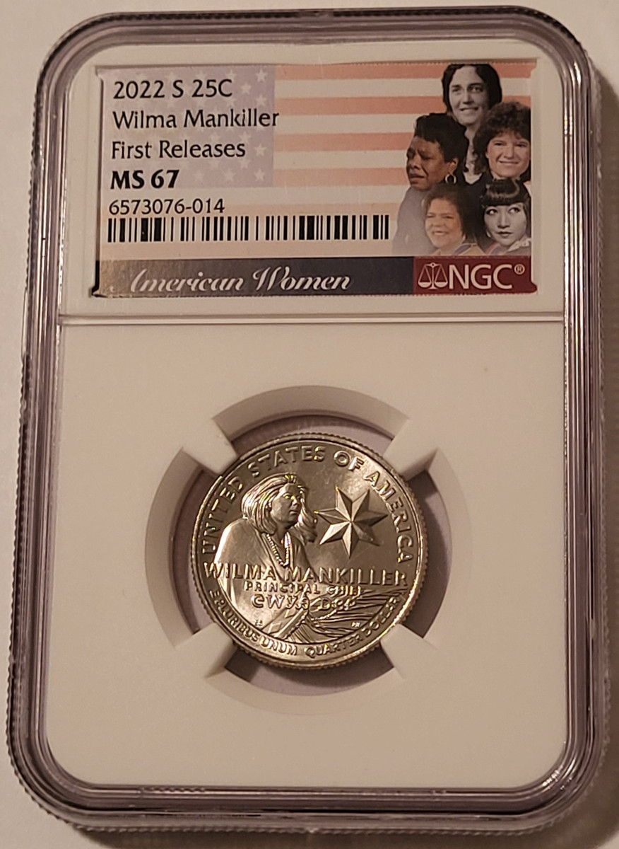 6573076014 | 2022 S Wilma Mankiller Quarter. Copper-Nickel/Clad. Mint State 67 NGC First Releases. Flag Label.