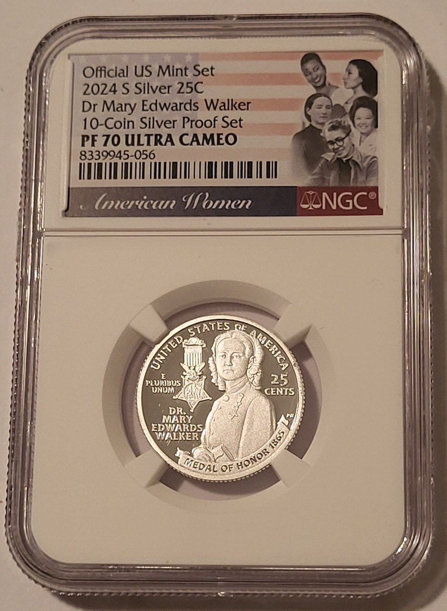8339945056 | 2024 S Dr. Mary Edwards Walker Quarter. Silver, .999 Fine. Proof-70 Ultra Cameo NGC Flag Label.