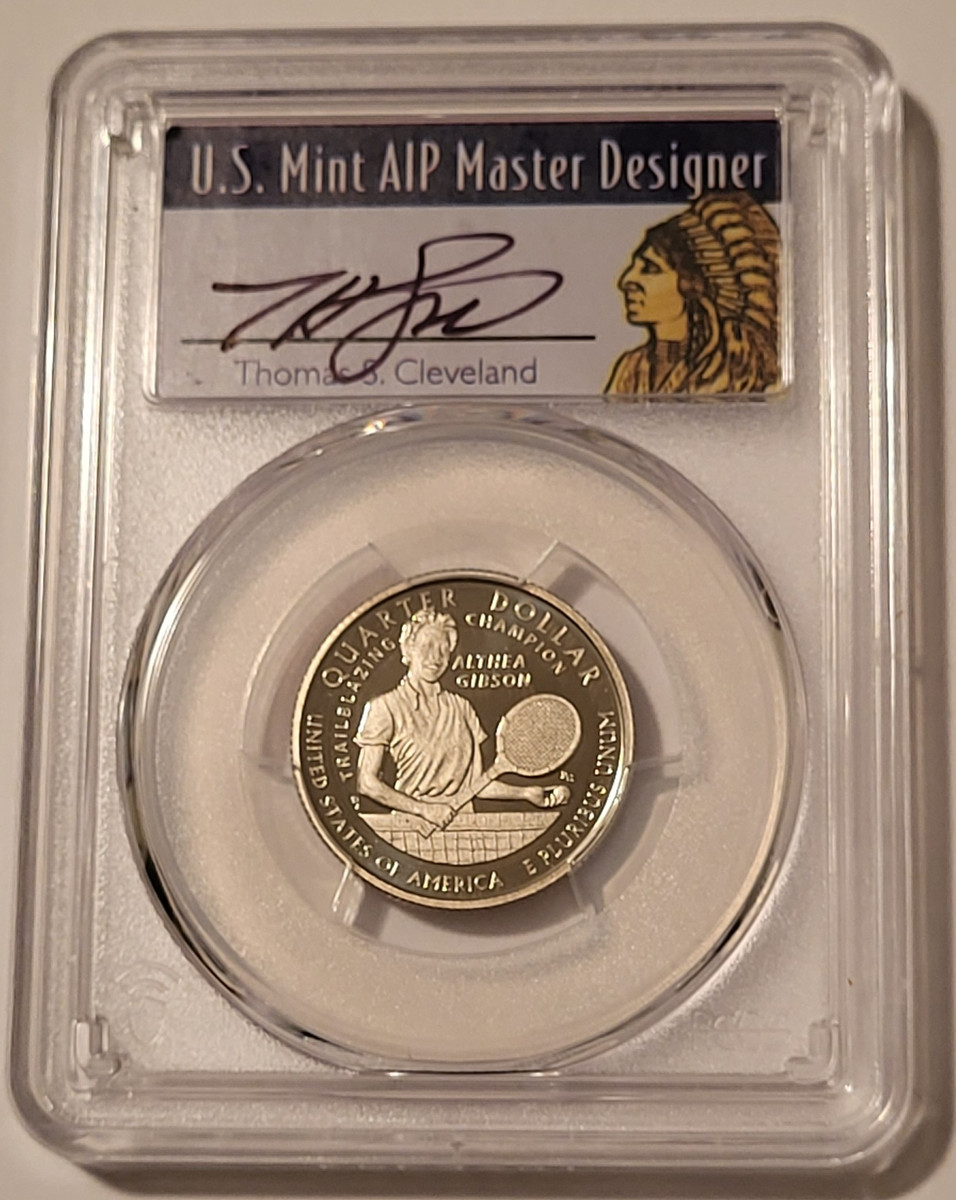 56099581 | 2025 S Clad Althea Gibson Quarter. Copper-Nickel/Clad. Proof-70 Deep Cameo PCGS First Strike. Thomas S. Cleveland Hand-Signed, Native Label.