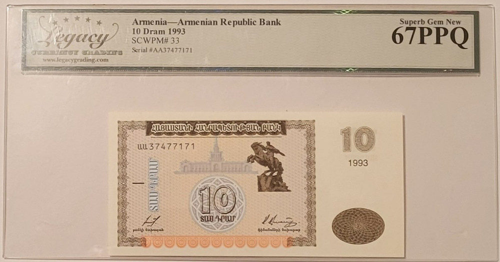 80960354 | Armenia 1993 10 Dram Bank Note. SCWPM# 33; Serial Number: AA37477171. Superb Gem New 67 Legacy Currency Grading.