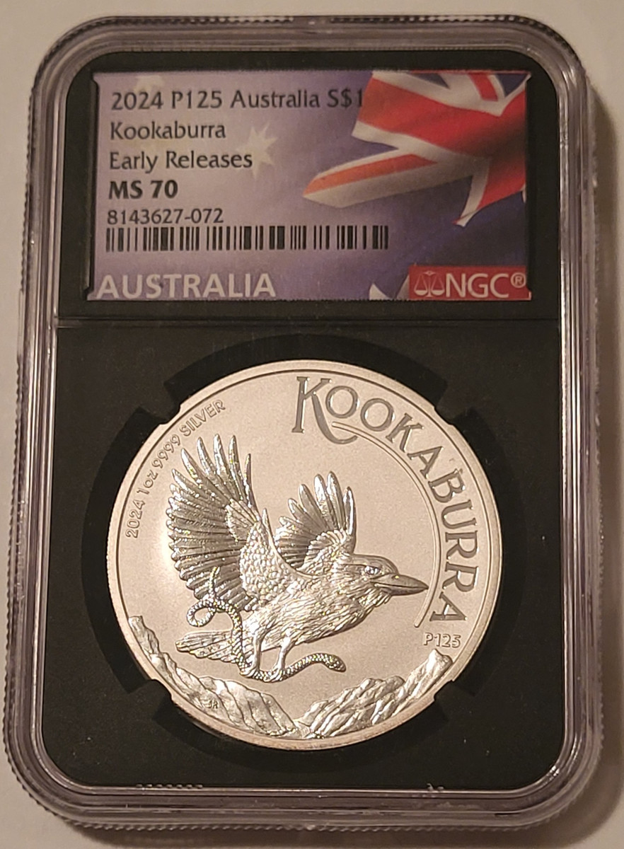8143627072 | Australia Charles III 2024 P125 1 Ounce Silver Dollar. Kookaburra. Mint State 70 NGC Early Releases. Black Retro Holder/Flag Label.