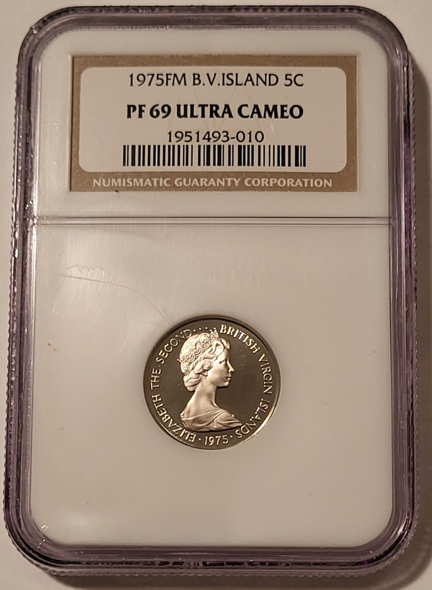 1951493010 | British Virgin Islands Elizabeth II 1975 FM 5 Cents - Zenaida Doves. Copper-Nickel. Proof-69 Ultra Cameo NGC. Low mintage of 32,000.