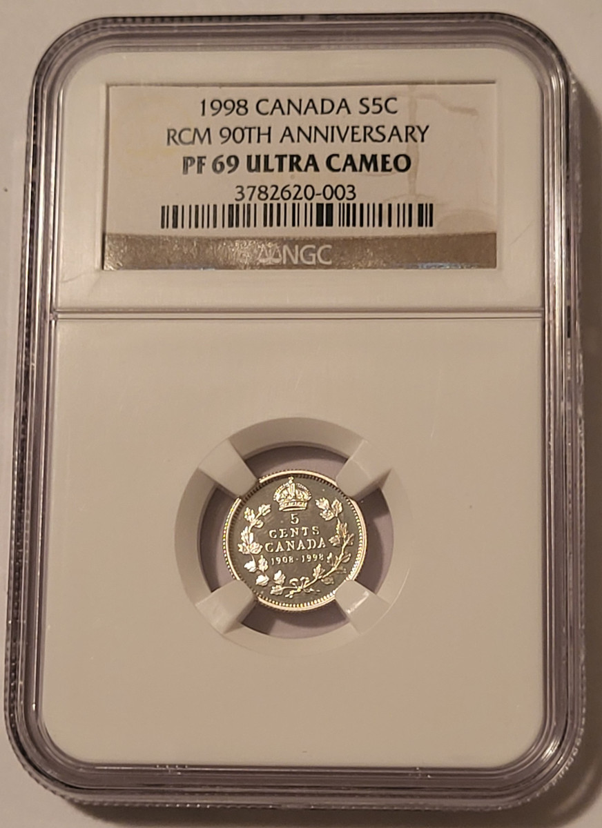 3782620003 | Canada Elizabeth II 1998 5 Cents. Silver. Royal Canadian Mint 90th Anniversary. Proof-69 Ultra Cameo NGC. Low mintage of 25,000.