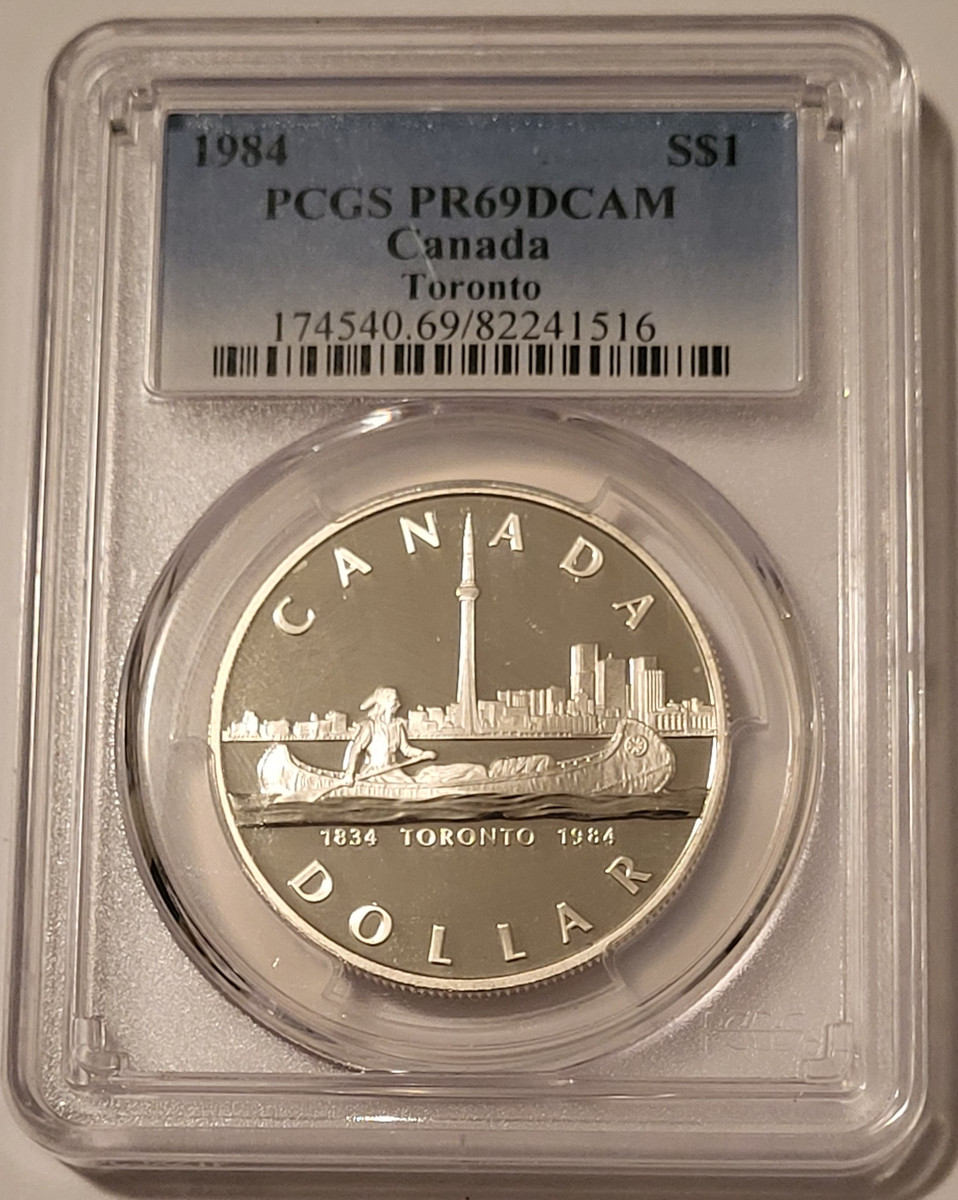 82241516 | Canada Elizabeth II 1984 Silver Dollar - Toronto Sesquicentennial (23.3726 grams, .500 fine). Proof-69 DCAM PCGS.