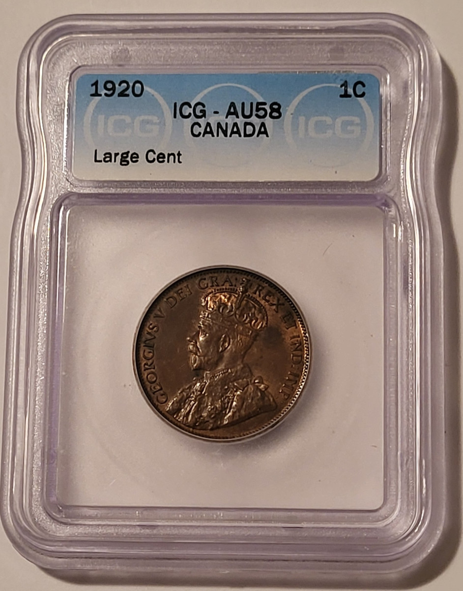 7564859001 | Canada George V 1920 Large Cent. Bronze. About Uncirculated 58 (BN) ICG.