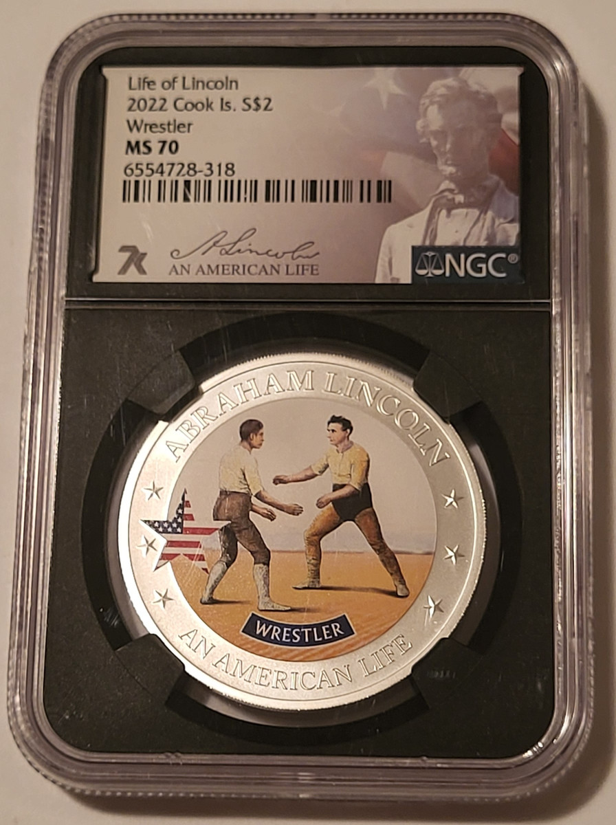 6554728318 | Cook Islands 2022 Two Dollars. Silver (1/2 oz, .999 fine). Colorized Obverse. Life of Abraham Lincoln: Wrestler. Mint State 70 NGC. Black Retro Holder. Low mintage of 5,000.