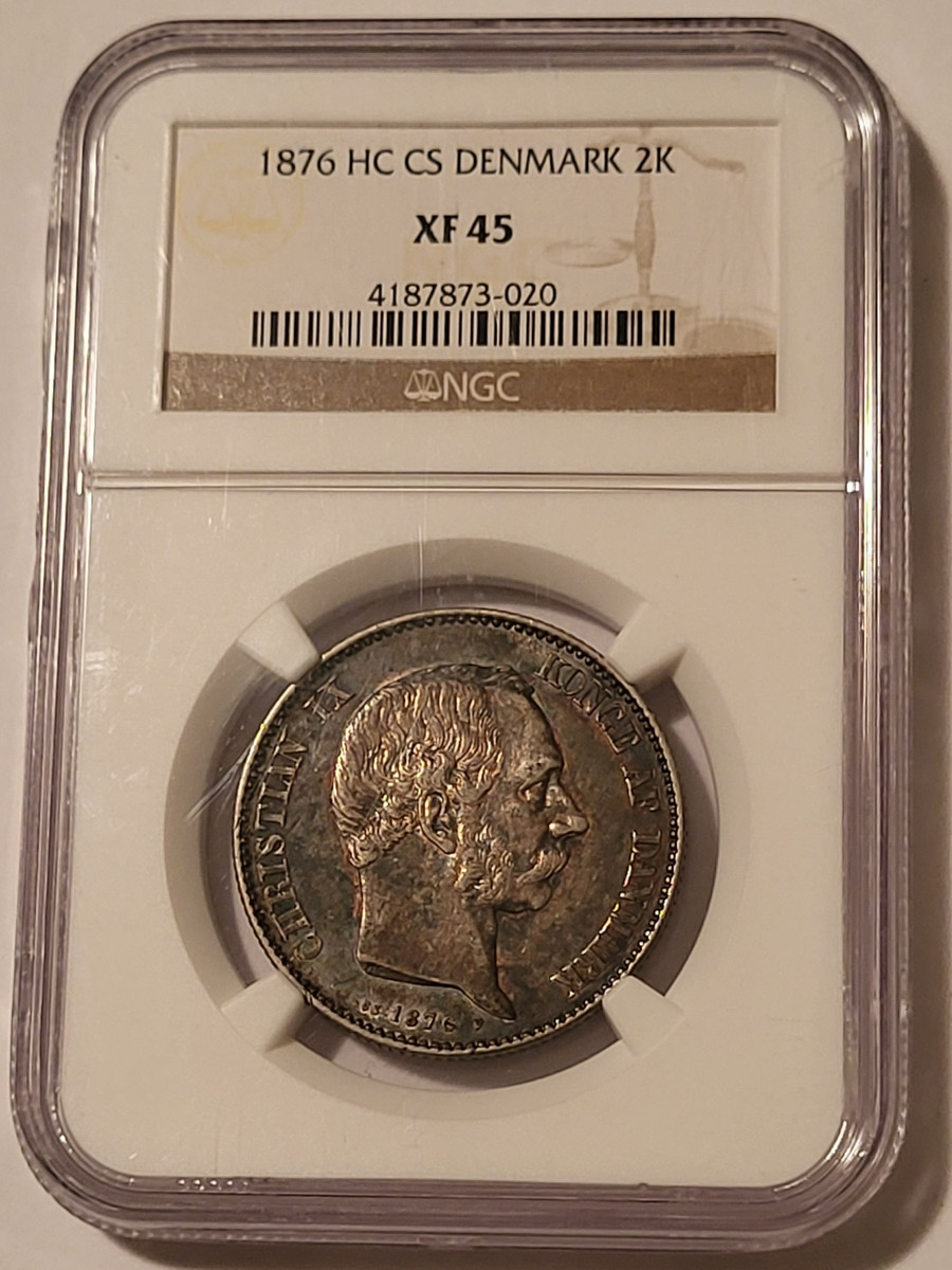 4187873020 | Denmark Christian IX 1876 HC CS 2 Kroner. Silver. Extremely Fine 45 NGC. Toned. Two-Year Type, Key Date.