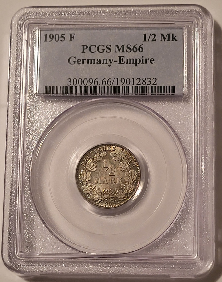 19012832 | German Empire Wilhelm II 1905 F 1/2 Mark. Silver. Mint State 66 PCGS. Toning.