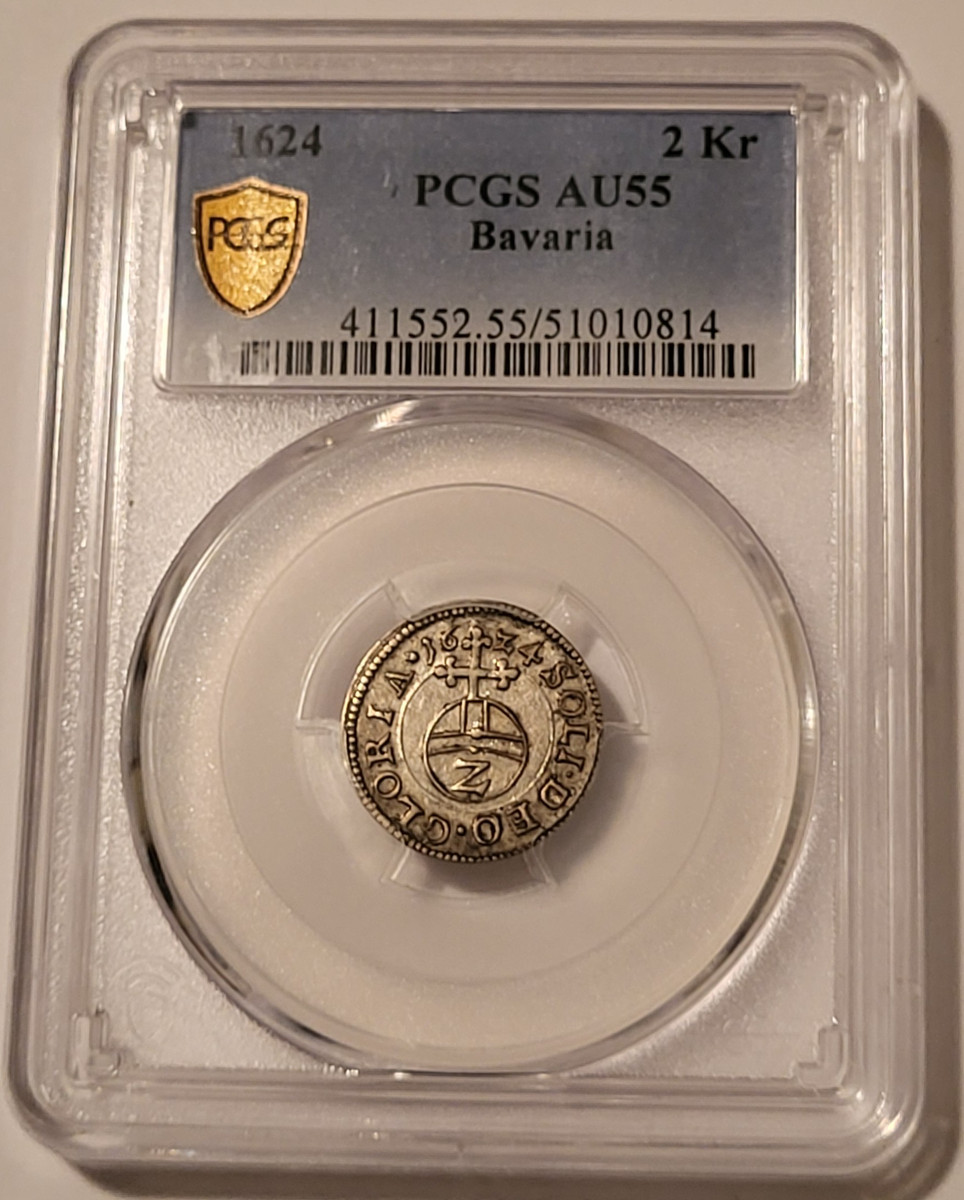 51010814 | German States Bavaria 1624 2 Kreuzer. KM128.1, Silver. About Uncirculated 55 PCGS Gold Shield Holder. Toning.