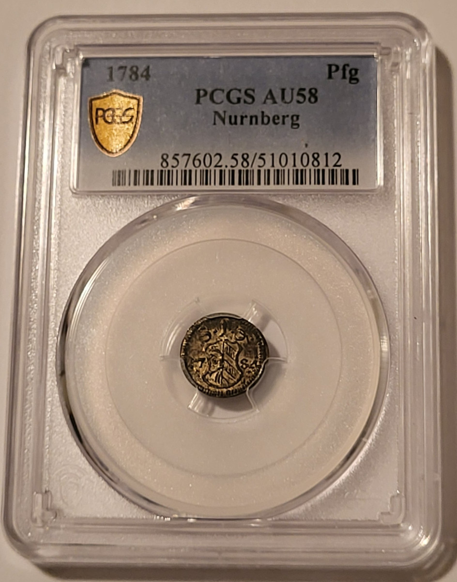 51010812 | German States Era Nurnberg 1784 Pfennig. Billon. Uniface. About Uncirculated 58 PCGS Gold Shield Holder. Toning. Top Pop 1/0.