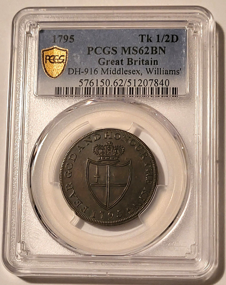 51207840 | Great Britain 1795 1/2 Penny Conder Token. Middlesex - Williams', London. DH-916, Copper. Mint State 62 BN PCGS Gold Shield Holder.