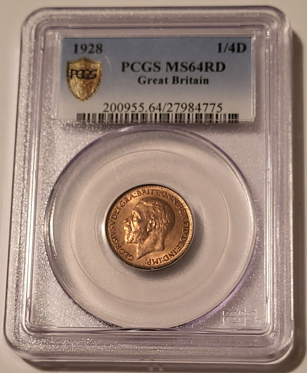 27984775 | Great Britain George V 1928 1/4 Penny Farting. KM-825, Bronze. Reverse: Britannia seated. Mint State 64 Red PCGS Gold Shield Holder.