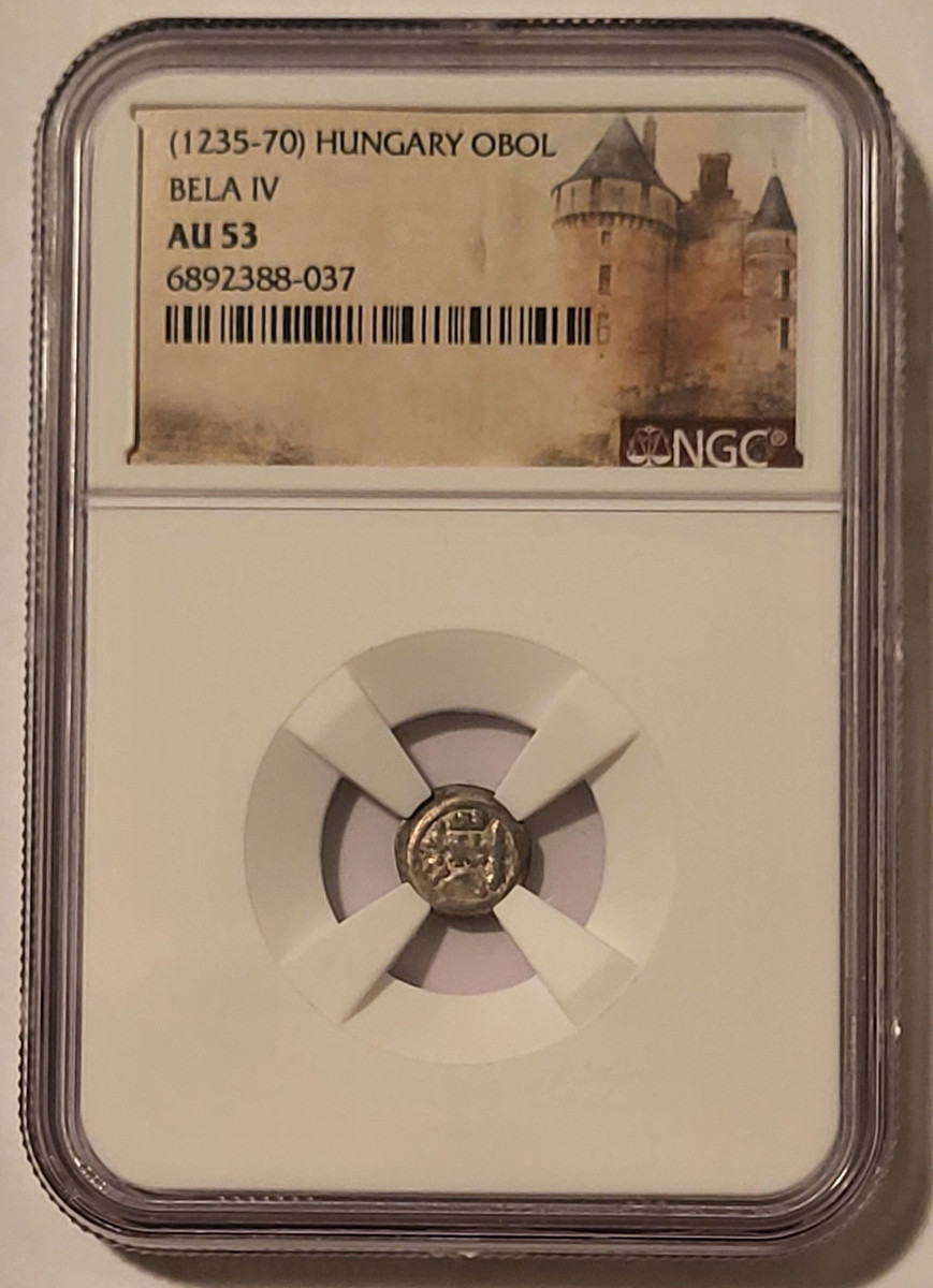 6892388037 | Middle Ages: Hungary Bela IV (1235-70) Silver Obol. Hebrew Letter "Chet". About Uncirculated 53 NGC.