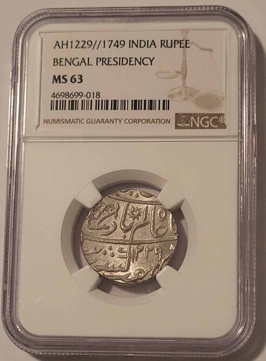 4698699018 | India, Bengal Presidency AH1229//17-49 (c 1830 AD) Silver Rupee. KM-41, Plain Edge. Mint State 63 NGC.