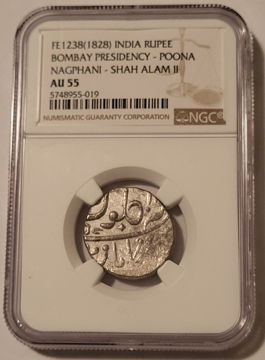 5748955019 | India, Bombay Presidency Shah Alam II FE1238 (AD 1828) Silver Rupee Poona Nagphani. About Uncirculated 55 NGC.