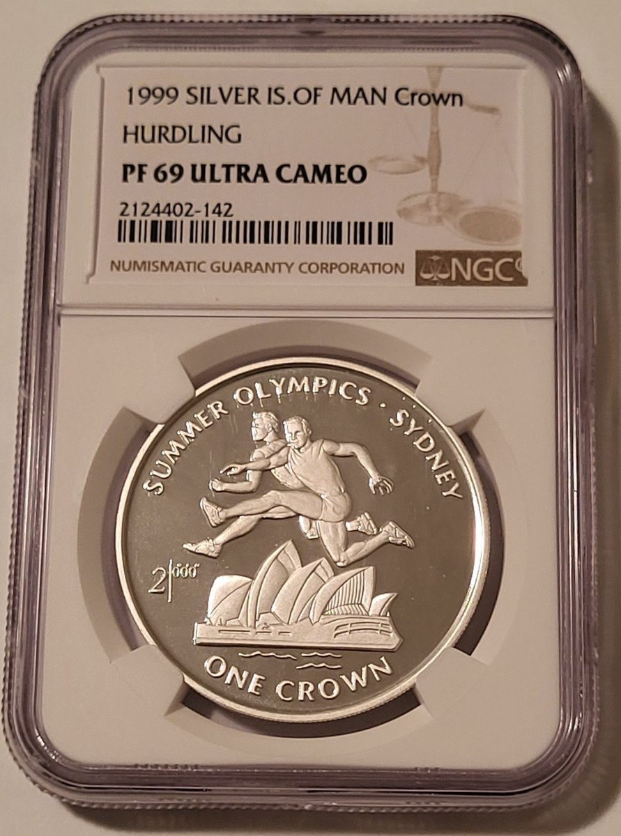 2124402142 | Isle of Man Elizabeth II 1999 Crown. Silver. 28.28 grams, .925 fine. Olympics - Hurdling. Proof-69 Ultra Cameo NGC.