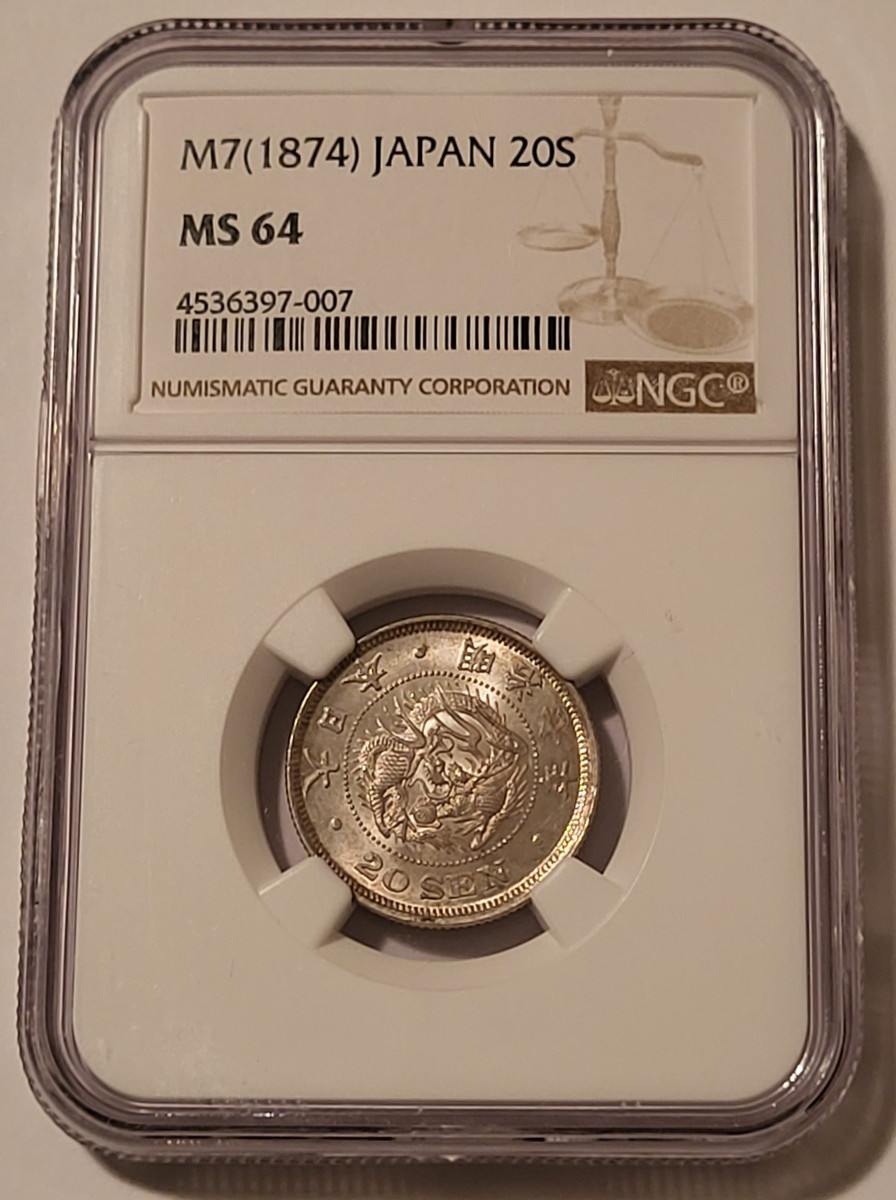 4536397007 | Japan Meiji Era Year 7 (AD 1874) 20 Sen. Silver. Mint State 64 NGC. Light Toning.