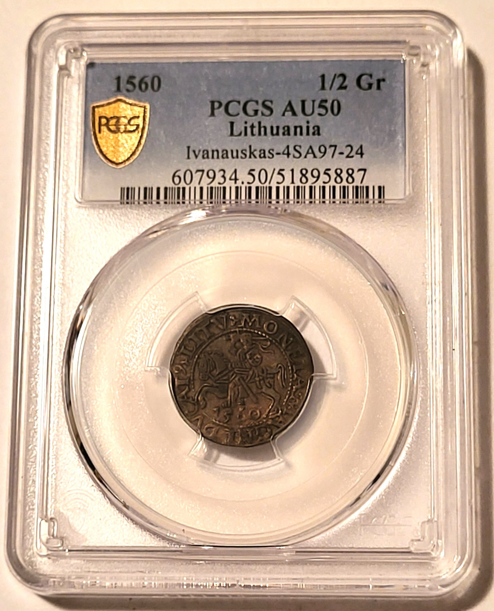 5189887 | Lithuania Sigismund II "Augustus" 1560 1/2 Grosz. Silver. About Uncirculated 50 PCGS Gold Shield Holder. Toned.