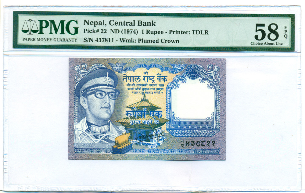 8070903005 | Nepal, Central Bank 1974 1 Rupee Note. Pick #22; Printer: TDLR; Serial Number: 437811; Watermark: Plumed Crown. Choice About Uncirculated Exceptional Paper Quality PMG.