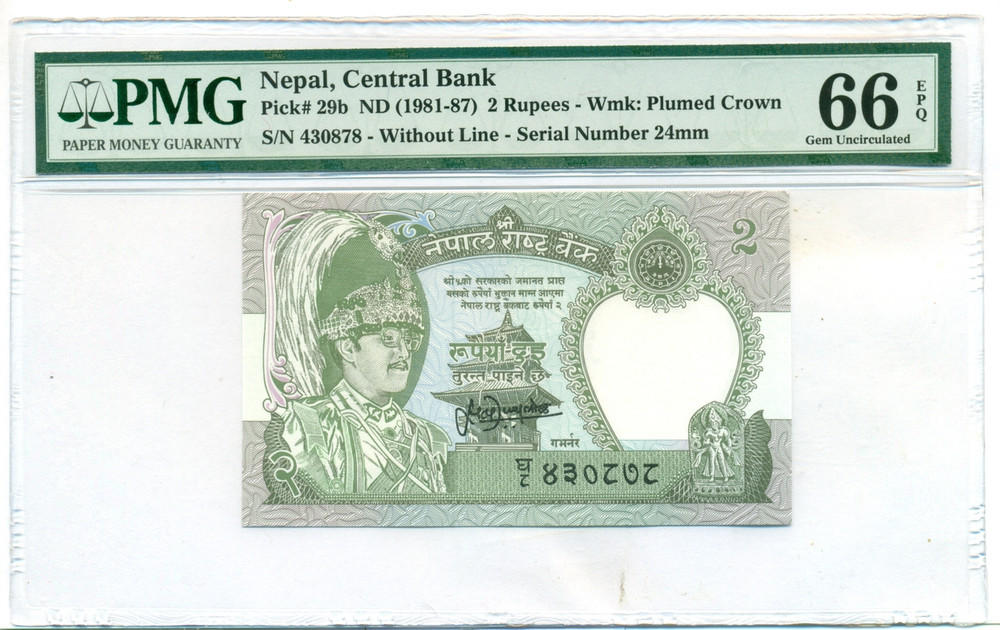 8046992020 | Nepal, Central Bank 1981-87 2 Rupees Note. Pick# 29b. Serial Number: 430878 - Without Line - 24mm. Watermark: Plumed Crown. Gem Uncirculated 66 Exceptional Paper Quality PMG.