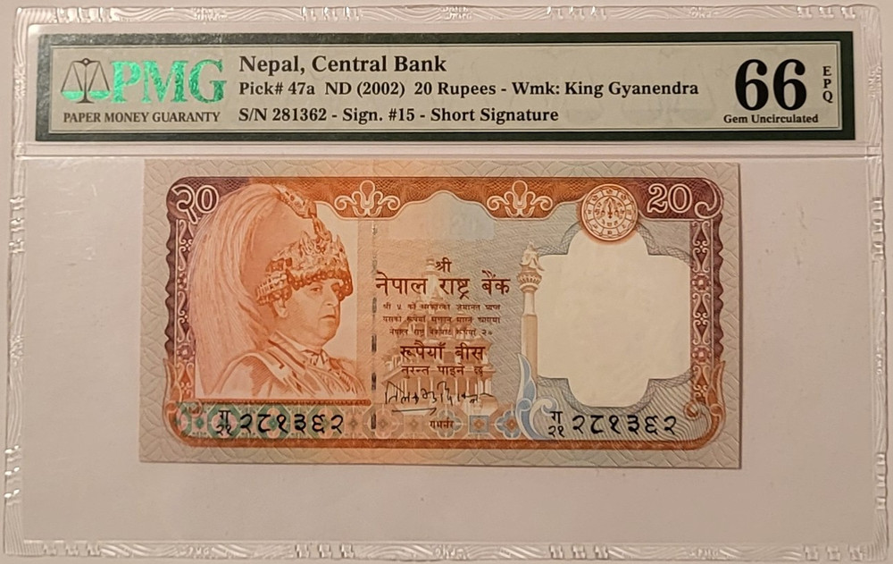1821160060 | Nepal, Central Bank 2002 20 Rupees Note. Pick# 47; Serial Number: 281362; Signature: #15 - Short. Gem Uncirculated 66 Exceptional Paper Quality PMG.
