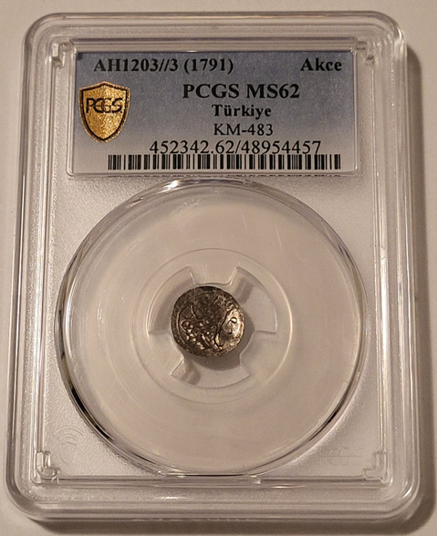 48954457 | Ottoman Empire (Turkey) Selim III AH1203//3 (AD 1791) Akce. KM-483, Silver. Mint State 62 PCGS Gold Shield Holder.