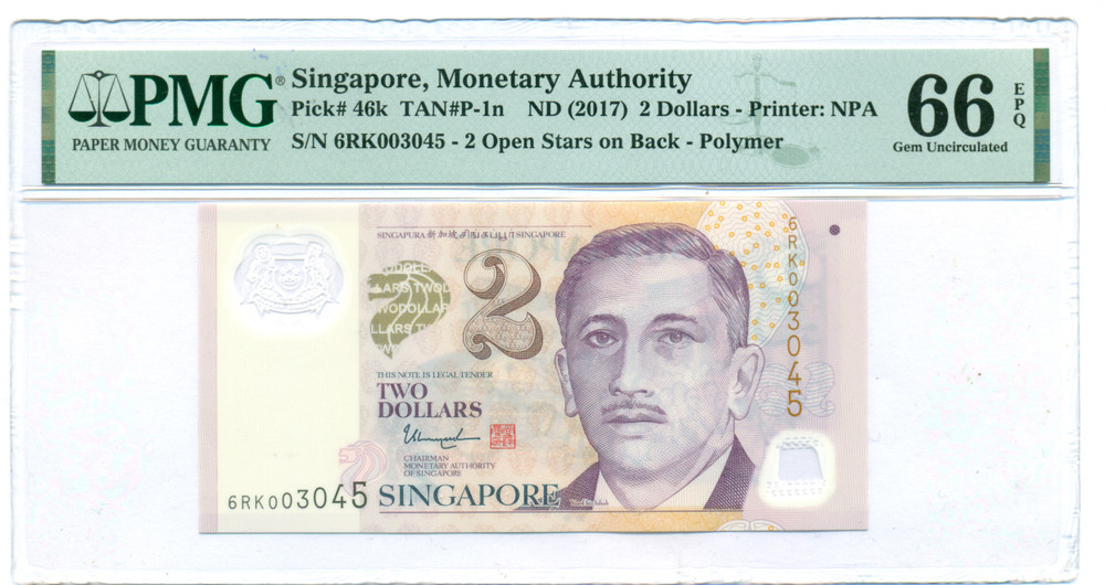 1963722066 | Singapore, Monetary Authority 2017 2 Dollars Bank Note. Pick# 46k TAN#P-1n; Serial Number: 6RK003045; 2 Open Stars on Back - Polymer. Gem Uncirculated 66 Exceptional Paper Quality PMG.