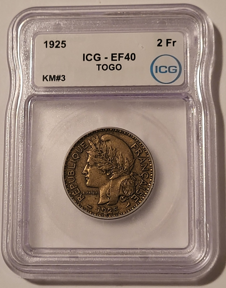 60340811001 | Togo (French Africa) 1925 2 Francs. Aluminum-Bronze. Extremely Fine 40 ICG.