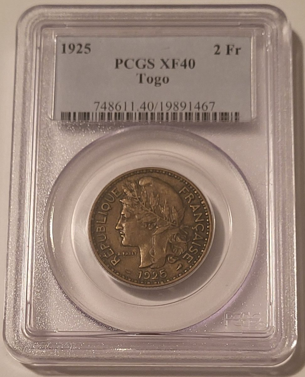 19891467 | Togo (French Africa) 1925 2 Francs. Aluminum-Bronze. Extremely Fine 40 PCGS. Toned.