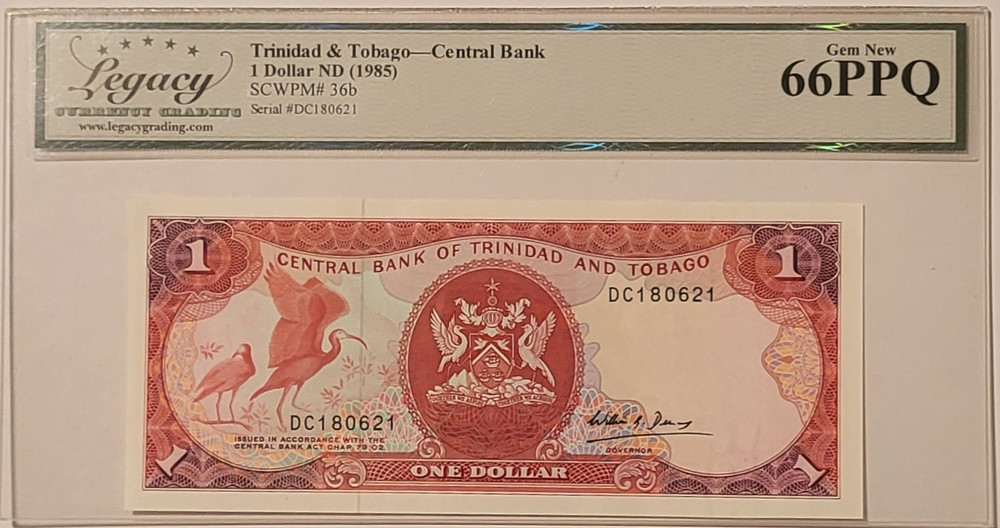 80857586 | Trinidad & Tobago 1985 1 Dollar Bank Note. SCWPM# 36b; Serial Number: DC180621. Gem New 66 Premium Paper Quality Legacy Currency Grading.