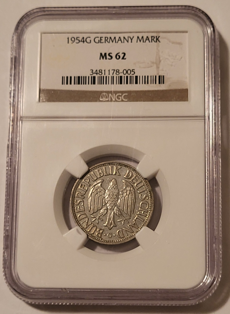 3481178005 | West Germany 1954 G Mark. Copper-Nickel. Mint State 62 NGC. Light Patina. Scarce in mint state - high guide value.